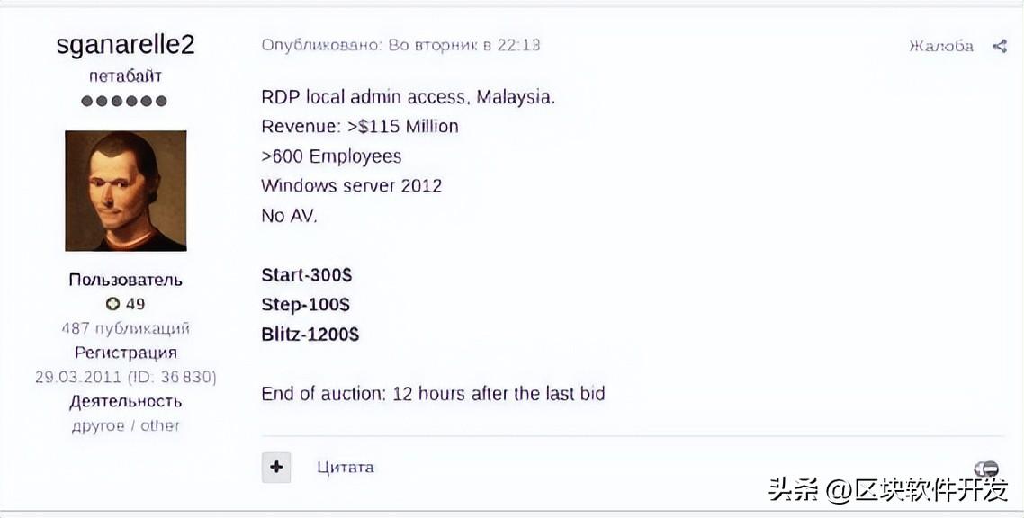 关于漏洞(例如SQL注入)和合法凭据(例如RDP/SSH)的信息,对于收入可观的公司来说,定价会非常不同,因为它们提供了不同的成功攻击概率。出售帐户以访问远程管理接口(RDP、SSH)意味着已经获得了对公司网络基础设施系统的访问权限,而漏洞仅仅提供了实现类似级别访问的机会。