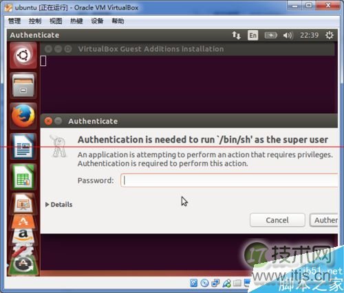 本教程将简要介绍在ubuntu虚拟机中安装增强功能的步骤。软件名称:VirtualBox v5.0.4-102546 虚拟机 多国语言官方安装版软件大小:103MB更新时间:2015-09-091、选中ubuntu虚拟机,点击上方的”启动“按钮,启动虚拟机2、在”设备“下拉菜单中,点击”安装增强功能“按钮:3、之后在虚拟机中会弹出”安装增强功能“对话框, 点击”run “按钮,4、之后会弹出授权对话框,需要安装权限,输入安装时候的用户密码:5、输入密码后点击”Author“按钮进行安装,会弹出安装过程对话框:6、安装完成后按回车键退出终端,然后点击右上角的按钮,选择重启虚拟机:7、重启后就可以自动调整显示分辨率,以及使用共享文件夹等功能了。
