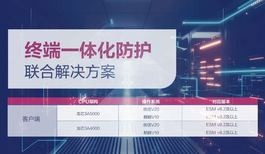 近日,亚信亚信安全与龙芯中科技术股份有限公司(简称“龙芯中科”)联合测试并共同发布,安全案亚信安全信端-端点安全管理系统ESM与龙芯CPU成功适配,适手可以在龙芯3A5000、配龙3A4000处理器平台上稳定运行,芯携相互兼容,布国可为政企用户提供安全可靠的产终终端环境。在此基础上,端体亚信安全与龙芯携手打造的化防护联合解国产终端一体化防护联合解决方案正式发布。