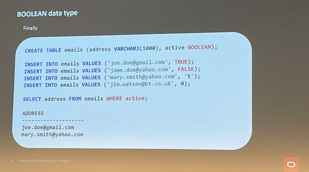 最终,在 Oracle Database 23c 中,布尔数据类型被支持: