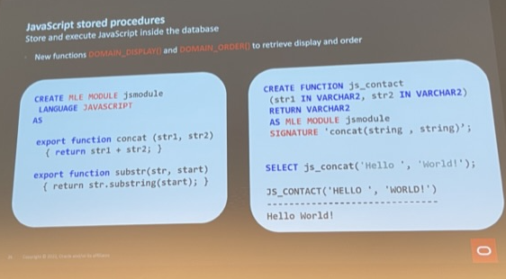 在Oracle 21c中引入的 MLE 支持了数据库内部的Javascript ,现在更进一步,23c实现 javascript 存储过程,让数据库内的处理能力进一步扩展和增强: