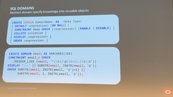 在 Oracle Database 23c 中,域可以定义为数据库对象,并且在定义列时,可以将其链接到域定义,形成一个潜在元数据组。通过新函数 DOMAIN_DISPLAY 和 DOMAIN_ORDER 可以在查询语句中使用显示格式和 order by 表达式。