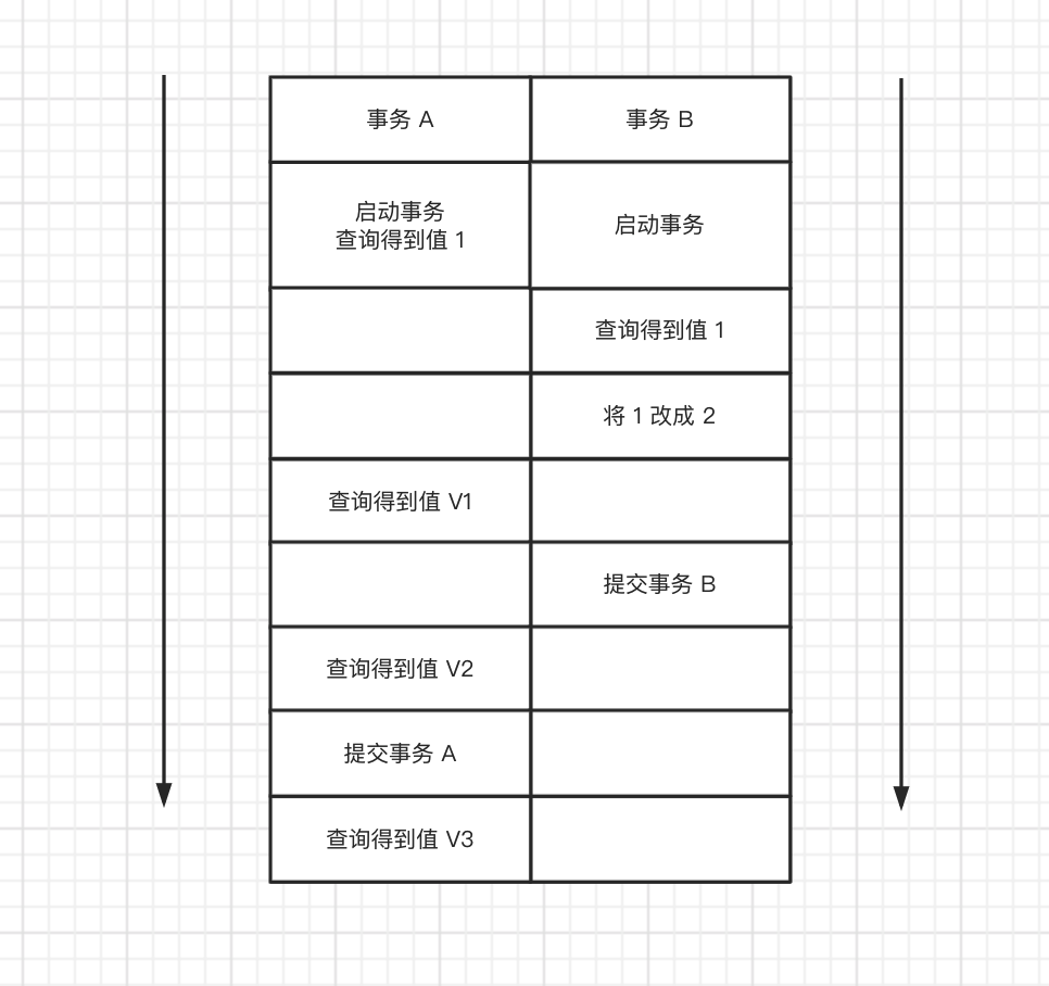 我们来看看在不同的隔离级别下,事务 A 会有哪些不同的返回结果,也就是图里面 V1、V2、V3 的返回值分别是什么。
