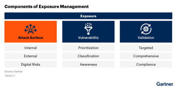 在Gartner报告中,攻击面管理(ASM)是一组更广泛的功能—— “敞口管理”(Exposure Management)——中的第一个支柱,其他组成因素还包括漏洞和验证管理。