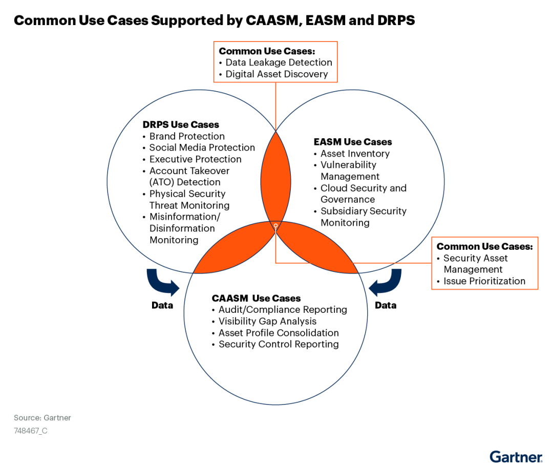 Gartner认为,ASM涉及三个新兴的技术创新领域,即网络资产攻击面管理(CAASM)、外部攻击面管理(EASM)以及数字风险保护服务(DRPS)。