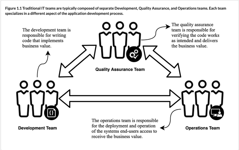 图:传统IT部门由开发、QA、运营团队组成每个团队专注于不同的分工和角色。