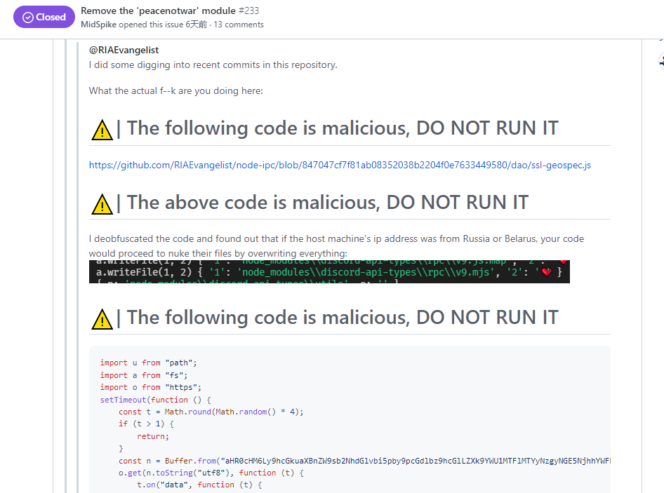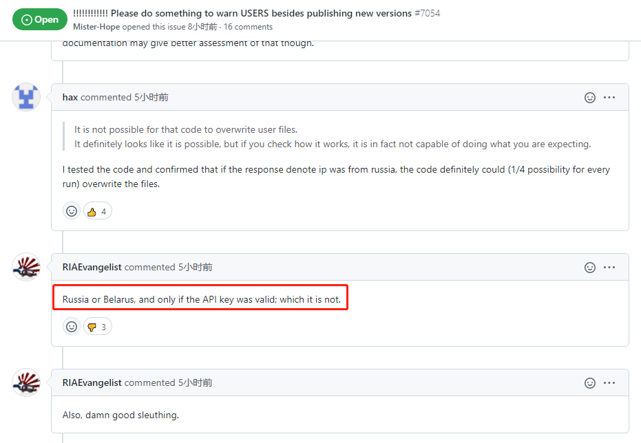注意:该作者清晰地知道自己在做什么,以及这些代码意味着什么,他在 issue 里明确指出了下游可以消除影响的变通方法。在该 vue-cli issue 对话 中,RIAEvangelist 更是大方承认自己的恶意代码是针对俄罗斯和白俄罗斯用户