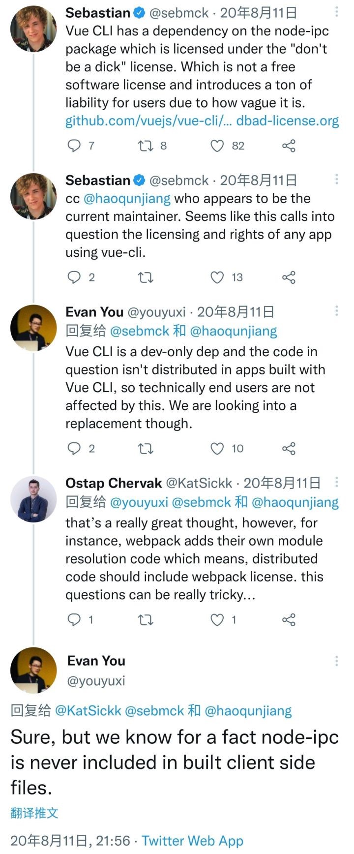 而且,这不是 RIAEvangelist 和他的这个 node-ipc 包第一次引起争议了,早在 2020 年 node-ipc 就因为其奇怪的“dont be a dick”许可证引起了争议,尤雨溪还出面回应: