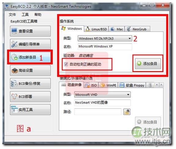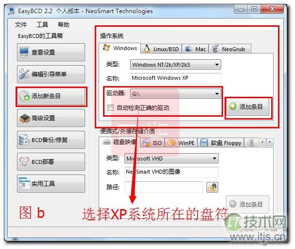 点击左边“添加新条目”,选择右边操作系统下的类型为“windows NT/2K/XP/2K3"名称可以自己修改(忘记修改也没事,下面还介绍怎样修改的)。可以选择“自动检测正确的驱动”在前面打勾如图a ;也可以自己选择驱动器(XP系统所在的盘符)如图b。