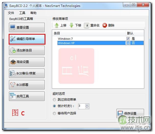然后点击左边“编辑引导菜单” 在右边可以修改默认启动项,重命名修改条目名称,设置引导菜单停留时间等选项,设置完后点击“保存设置”