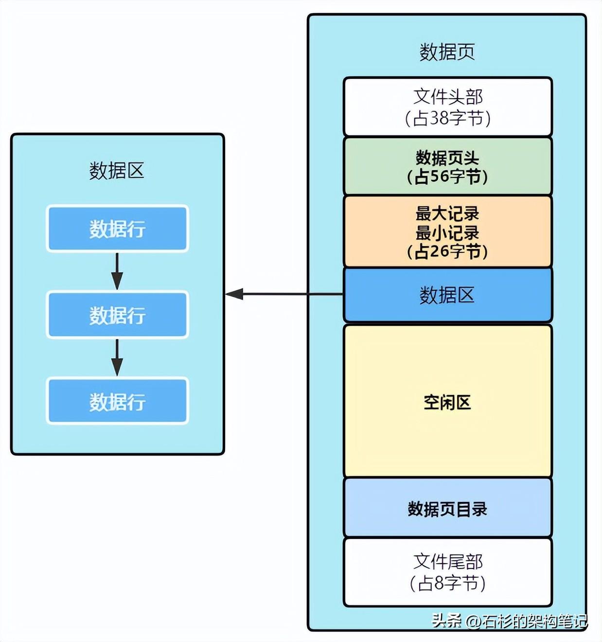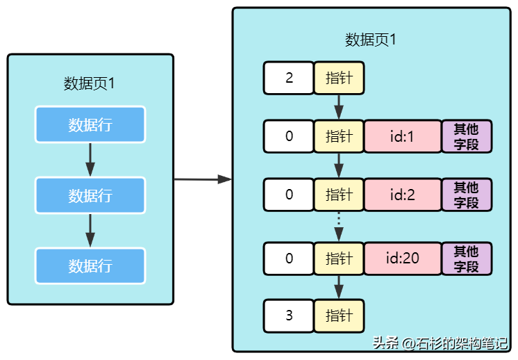 比如,我们以数据页1举例,数据页1中有很多的数据行,数据行之间都是用指针连接,并且以单向链表的方式组织起来的,并且单向链表中主键一定是保证有序的,无序的数据是没法创建索引的。