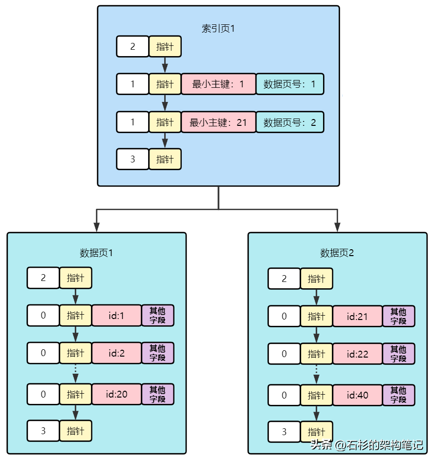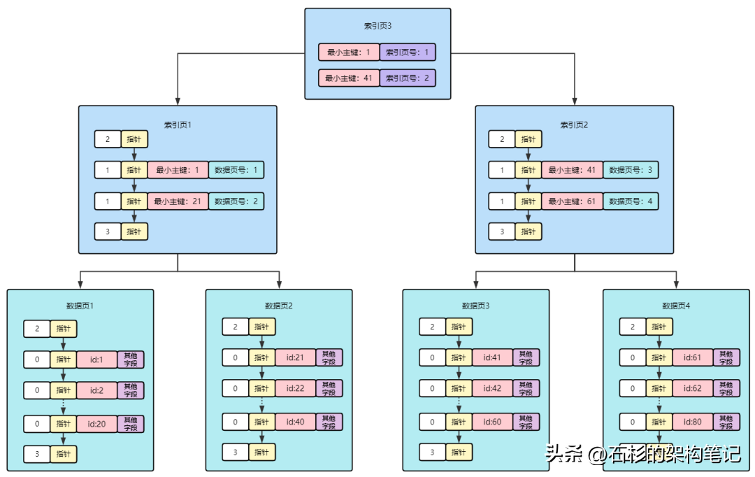 而如果数据页很多的话,一个索引页中肯定就放不下这些目录信息,此时,MYSQL会把超出索引页的目录信息放到新的索引页中,然后向上再扩展出一个索引页,如下图: