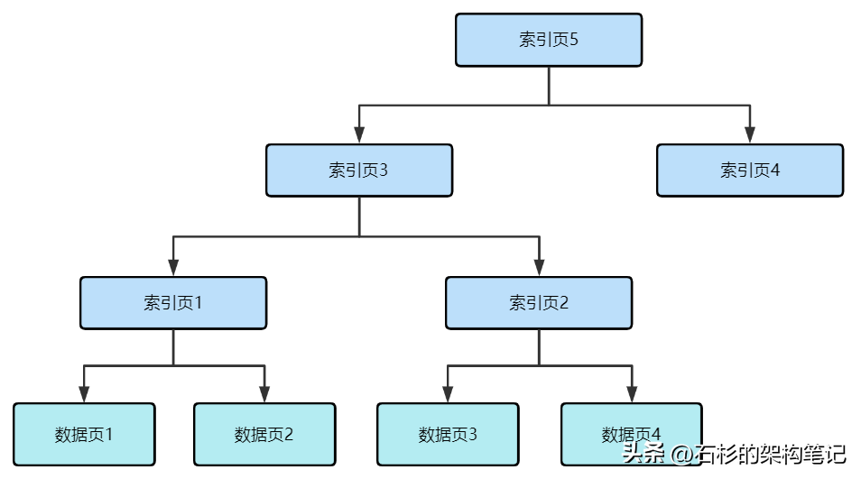而图片中,我们可以看到,索引页逐层的往上扩展,看起来就像一棵树一样,这也就是我们经常说的B+索引树,图片中索引的高度为3层,一般就可以存放千万级别的数据了。