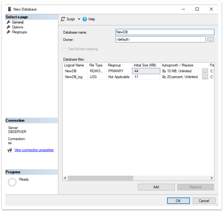 现在,我们将更改数据和日志文件的大小以及自动增长选项,然后单击“确定”。