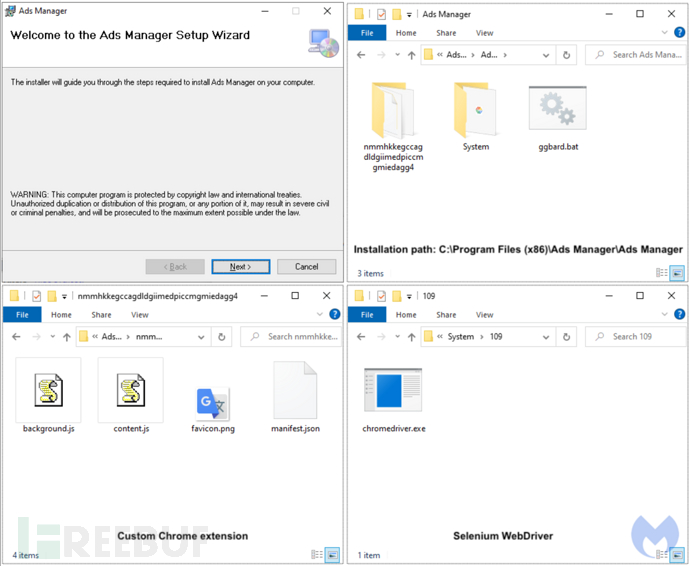恶意 Chrome 扩展压缩文件解压后,为一个 MSI 安装程序。该程序会在 C:\Program Files (x86)\Ads Manager\Ads Manager 下安装多个组件,包括批处理脚本与两个文件夹。其中有一个自定义的 Chrome 扩展,而 System 文件夹中包含单独的 WebDriver 文件。