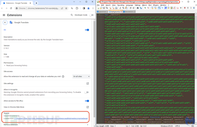 自定义扩展程序伪装成 Google Translate,但根据源码查看其进行了十六进制混淆,试图隐藏真实意图。