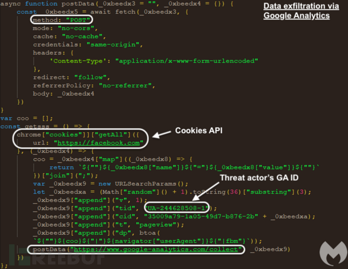 对扩展程序进行逆向分析后,可以知道其与谷歌翻译无关,旨在获取 Facebook 的账户凭据与 Cookie。攻击者除了使用 cookies.getAll 外,还使用 Google Analytics 窃取数据。