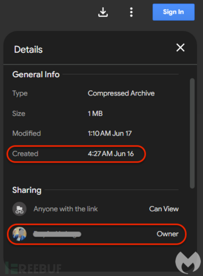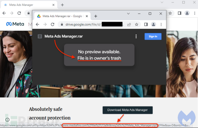 几天后,攻击者发现了这个错误,从 Google Drive 中删除了文件。也更新了钓鱼网站对应的链接,使用 MediaFire 托管了新文件。