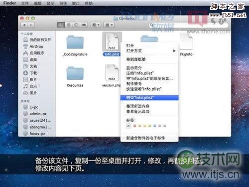 这个就是“Info.plist”文件了,直接打开修改的话会提示创建副本之类的,因此建议采用替换法,拷贝一份至桌面,并对拷贝版本进行修改,再替换回去。