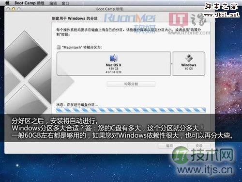 安装U盘制作成功,进入分区环节(需保证硬盘空余空间大于10GB)。反正Windows系统仅仅在某些特定场合才会使用,因此容量不必过大,30GB理论够用,60GB绝对够用!64G版本Air用户节哀,您还是别Boot Camp了,除非您选择放弃苹果系统。
