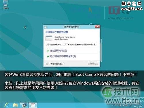 Windows 8系统装好后,笔者是遇到了Boot Camp驱动不兼容的问题,因此不推荐!至于该问题是否具有普遍性,还有待验证。全文小结:以上就是苹果电脑使用U盘安装Windows系统的详细流程。此方法优势在于您不需要准备Windows的原版系统光盘,也不需要使用随机系统盘进行驱动安装,不需要光驱,省事。不足之处在于U盘制作过程稍慢,系统安装速度甚至不及光盘!是否推荐:有光驱,有盘的情况下,这个可以省了;否则,您没得选择了吧?留一手永远是好的。