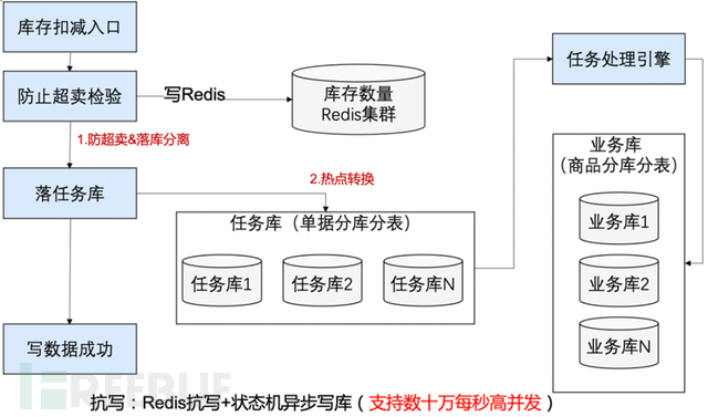 扣减库存其实包含两个过程:第一步是超卖校验,第二步是扣减数据的持久化;在传统数据库扣减中,两步是一起完成的。抗写的实现原理其实是巧妙的利用了分离的思想,分离开防超卖和数据持久化;首先防超卖是由Redis来完成的;通过Redis防超卖后,只要落库就可以;落库通过任务引擎,业务数据库使用商品分库分表,任务引擎任务通过单据号分库分表,热点商品的落库会被状态机分散开,消除热点。