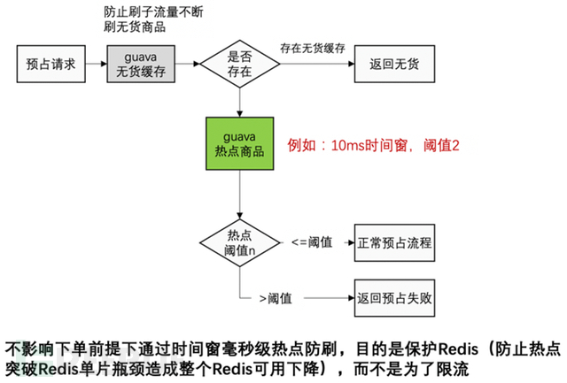 但Redis也是有瓶颈的,如果出现过热SKU就会打向Redis单片,会造成单片性能抖动。库存防刷有个前提是不能卡单的。可以定制设计JVM内毫秒级时间窗的限流,限流的目的是保护Redis,尽可能的不限流。限流的极端情况就是商品本来应该在一秒内卖完,但实际花了两秒,正常并不会发生延迟销售,之所以选择JVM是因为如果采用远端集中缓存限流,还未来得及收集数据就已经把Redis打死。
