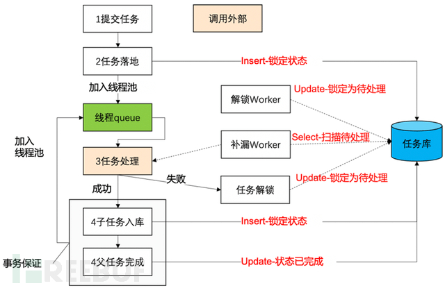 注:原来的最初版本,任务落库是待处理,然后由扫描Worker进行扫描,为了防止并发重复处理,扫描后进行单个任务锁定,锁定成功再进行处理。后来优化为落库任务直接标识状态为「锁定处理」,是为了性能考虑,省去重新扫描再抢占任务,在进程内直接通过线程异步处理。