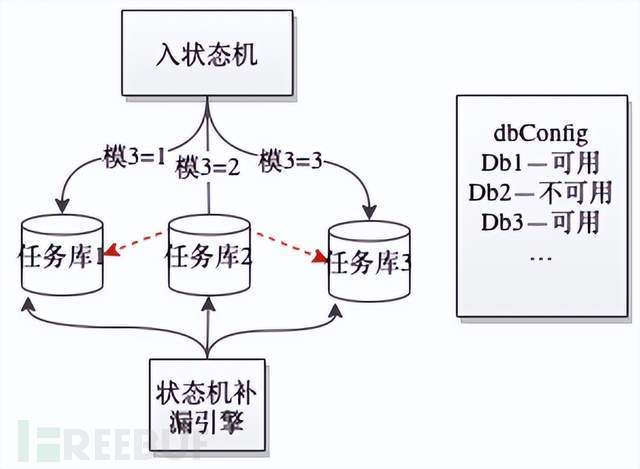 任务库使用分库分表,当一个库宕机,可以把路由到宕机库的流量重新散列到其他存活库中,可以手工配置,或通过系统监控来自动化容灾。如下图,当任务库2宕机后,可以通过修改配置,把任务库2流量路由到任务库1和3。补漏引擎继续扫描任务库2是因为当任务库2通过主从容灾恢复后,任务库2宕机时未来的及处理的任务可以得到补充处理。
