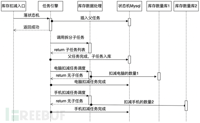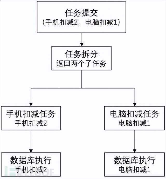 比如用户购买了两个手机和一个电脑,手机和电脑分散在两个数据库,通过任务引擎先持久化任务,然后驱动拆分为两个子任务,并最终保证两个子任务一定成功,实现数据的最终一致性。整个执行过程的任务编排如下:
