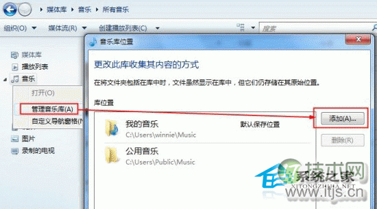 因为表弟之前从未用WMP12,所以当前媒体库里还没有音乐列表,只能从转到本地文件夹里把刻录的音乐拖到“刻录列表”。假如想把音乐都添加到媒体库去也很简单,右键点击媒体库的音乐分类,选择“管理音乐库”,在随后打开的窗口里点击“添加”找到音乐文件所在的文件夹,随后媒体库会自动导入文件夹里的所有音乐并分类。企商汇