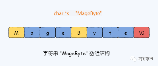 先看 C 语言字符串数组的结构。比如通过 char *s = "MageByte"定义字符串变量。