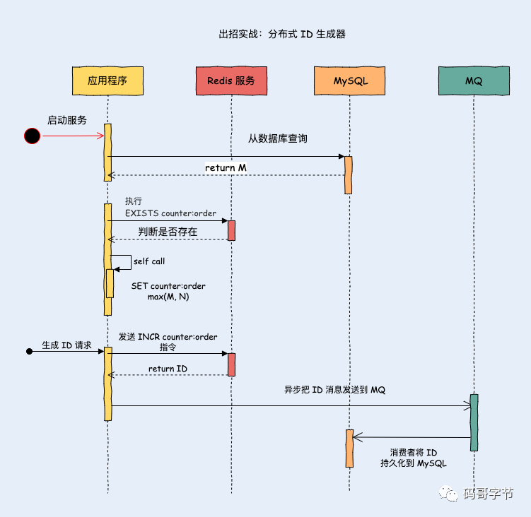 设计思路假设订单 ID 生成器的 key 是“counter:order”,当应用服务启动的时候先从数据库中查询出最大值 M。执行EXISTS counter:order 判断是否存在 key。Redis 中不存在 key “counter:order”,执行SET counter:order M 将 M 值作写入 Redis。Redis 中存在 key “counter:order”,值为 K,那么就比较 M 和 K 的值,执行SET counter:order max(M, N)将最大值写入 Redis,相等的话就不操作。应用服务启动完成后,每次需要生成 ID 的时候,应用程序就向 Redis 服务器发送INCR counter:order指令。应用程序将获取到的 ID 值发送到 MQ 消息队列,消费者监听队列把值更新到 MySQL。