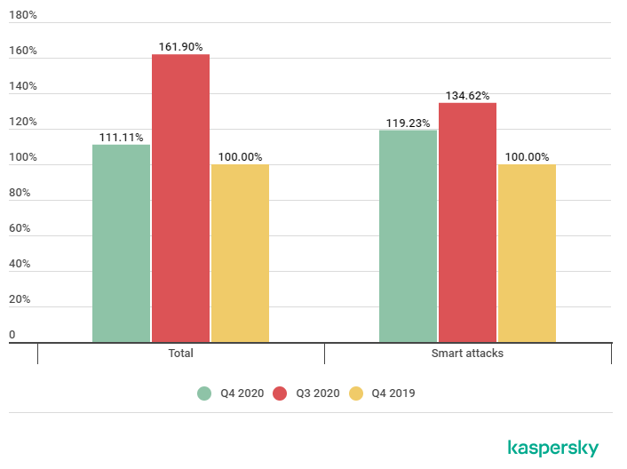 这次,我们的预测准确地实现了50%:正如预期的那样,在2020年第四季度,我们观察到的指标与2019年同期相当,甚至更高。但是,相对于2020年第3季度的增长(我们预计这是可能的)并未发生。相反,攻击总数下降了约30%,智能攻击下降了10%。
