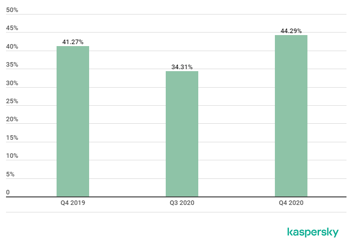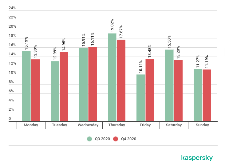 在第四季度,周四仍然是一周中最活跃的一天(17.67%),尽管其份额比上一季度下降了1.35个百分点。但是,最安静的一天的头衔又变了:这次,网络犯罪分子更喜欢在星期天站起来(11.19%)。更重要的是,“平静”和“暴风雨”天气的袭击次数范围从上一季度的近9个百分点缩小到6.48个百分点。在一年的最后三个月中,在星期二,星期三和星期五进行的攻击次数有所增加,而在其他工作日则有所减少。