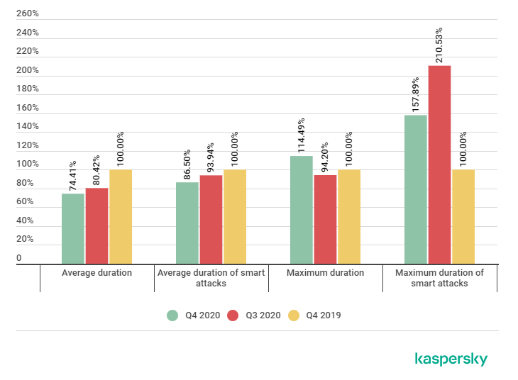 尽管如此,定性指标还是值得注意的:智能攻击的份额在第四季度略有增加,攻击持续时间的数据显示,短期攻击呈下降趋势,而长期攻击呈上升趋势。