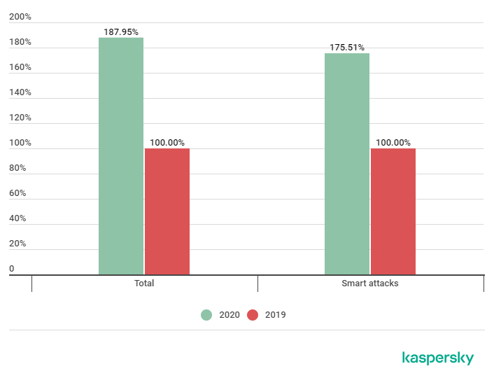 至于整个2020年的结果,该市场在一年中增长了不到一倍。请注意,这种增长纯粹是量化的:智能攻击的份额实际上保持不变。