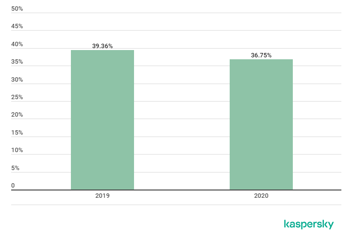 DDoS攻击的比较数量,2019年和2020年; 2019年数据取为100%