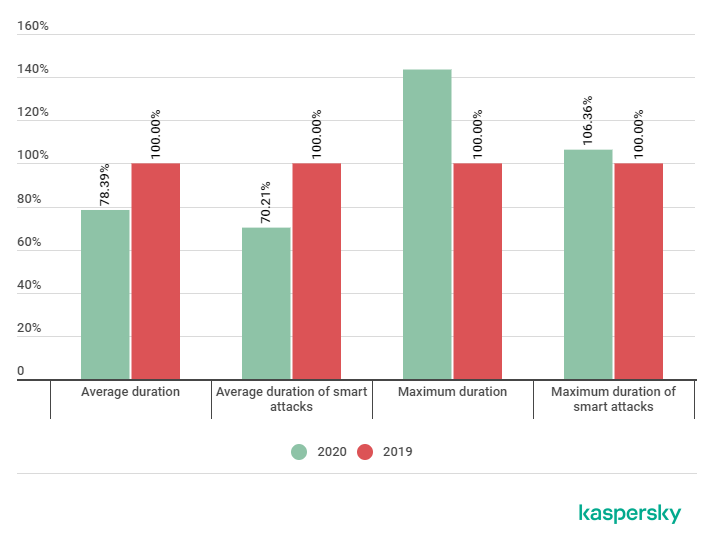 DDoS攻击的持续时间,2019年和2020年; 2019年数据取为100%