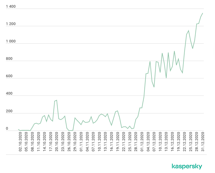 11月的最后几天开始出现显着增长,这一增长一直持续到本季度末,最可能的原因是卡巴斯基监控的僵尸网络数量增加,以及圣诞节和新年假期,通常伴随着圣诞节的到来网络犯罪活动激增。在线购物的整体增长(与节假日有关的购物及其他)也可能起到了一定作用。就DDoS而言,本季度最热的一天是12月31日,全球记录了1,349次攻击。