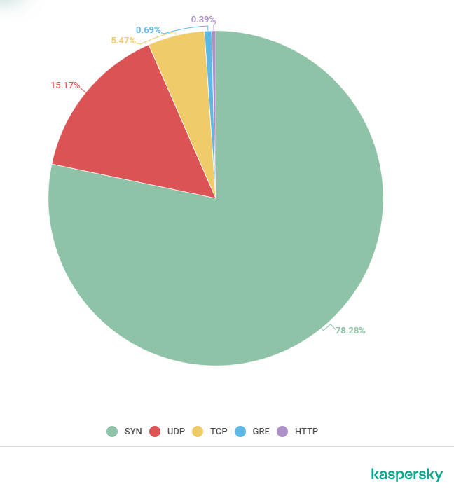 在第四季度,按类型划分的DDoS攻击的分布发生了巨大变化。SYN Floods仍然领先,但其份额下降了16.31个百分点至78.28%。同时,UDP泛洪的份额猛增(15.17%),在前三个季度不到2%。TCP攻击(5.47%)的数量也有所增加,但是以前在SYN攻击之后排名第二的ICMP泛滥在第四季度可以忽略不计,因此我们没有将其包括在统计中。