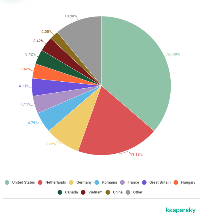 到2020年第四季度,用于控制DDoS僵尸网络的大部分C&C服务器位于美国,占服务器总数的36.30%。荷兰以19.18%的份额位居第二。德国以8.22%的成绩排名前三。