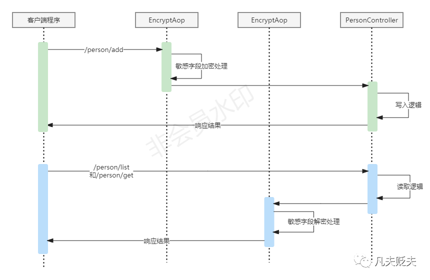 显然这种场景,对于加密的方式的选择,对称加密是最好的选择;那么如何实现对写入请求、读取请求的敏感数据的加密、解密处理呢?解决方案如下:
