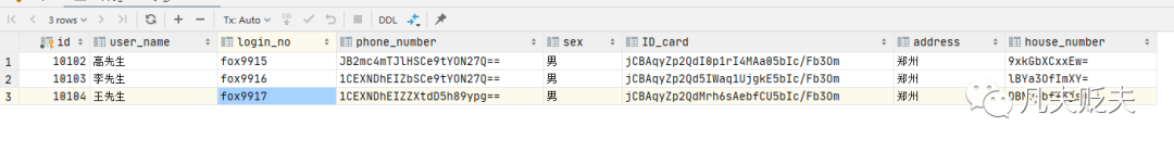 复制@Component @Aspect @Slf4j public class EncryptAop { /** * 定义加密切入点 */ @Pointcut(value = "@annotation(com.fanfu.anno.NeedEncrypt)") public void pointcut() { } /** * 命中加密切入点的环绕通知 * * @param proceedingJoinPoint * @return * @throws Throwable */ @Around("pointcut()") public Object around(ProceedingJoinPoint proceedingJoinPoint) throws Throwable { log.info("//环绕通知 start"); //获取命中目标方法的入参数 Object[] args = proceedingJoinPoint.getArgs(); if (args.length > 0) { for (Object arg : args) { //按参数的类型进行判断,如果业务中还有其他的类型,可酌情增加 if (arg != null) { if (arg instanceof List) { for (Object tmp : ((List) arg)) { //加密处理 this.deepProcess(tmp); } } else { this.deepProcess(arg); } } } } //对敏感数据加密后执行目标方法 Object result = proceedingJoinPoint.proceed(); log.info("//环绕通知 end"); return result; } public void deepProcess(Object obj) throws IllegalAccessException { if (obj != null) { //获取对象的所有字段属性并遍历 Field[] declaredFields = obj.getClass().getDeclaredFields(); for (Field declaredField : declaredFields) { //判断字段属性上是否标记了@EncryptField注解 if (declaredField.isAnnotationPresent(EncryptField.class)) { //如果判断结果为真,则取出字段属性值,进行加密、重新赋值 declaredField.setAccessible(true); Object valObj = declaredField.get(obj); if (valObj != null) { String value = valObj.toString(); //开始敏感字段属性值加密 String decrypt = this.encrypt(value); //把加密后的字段属性值重新赋值 declaredField.set(obj, decrypt); } } } } } private String encrypt(String value) { //这里特别注意一下,对称加密是根据密钥进行加密和解密的,加密和解密的密钥是相同的,一旦泄漏,就无秘密可言, //“fanfu-csdn”就是我自定义的密钥,这里仅作演示使用,实际业务中,这个密钥要以安全的方式存储; byte[] key = SecureUtil.generateKey(SymmetricAlgorithm.DES.getValue(), "fanfu-csdn".getBytes()).getEncoded(); SymmetricCrypto aes = new SymmetricCrypto(SymmetricAlgorithm.DES, key); String encryptValue = aes.encryptBase64(value); return encryptValue; } }1.2.3.4.5.6.7.8.9.10.11.12.13.14.15.16.17.18.19.20.21.22.23.24.25.26.27.28.29.30.31.32.33.34.35.36.37.38.39.40.41.42.43.44.45.46.47.48.49.50.51.52.53.54.55.56.57.58.59.60.61.62.63.64.65.66.67.68.69.70.71.72.73.74.75.76.77.78.79.80. 复制@Component @Aspect @Slf4j public class DecryptAop { /** * 定义需要解密的切入点 */ @Pointcut(value = "@annotation(com.fanfu.anno.NeedDecrypt)") public void pointcut() { } /** * 命中的切入点时的环绕通知 * * @param proceedingJoinPoint * @return * @throws Throwable */ @Around("pointcut()") public Object around(ProceedingJoinPoint proceedingJoinPoint) throws Throwable { log.info("//环绕通知 start"); //执行目标方法 Object result = proceedingJoinPoint.proceed(); //判断目标方法的返回值类型 if (result instanceof List) { for (Object tmp : ((List) result)) { //数据脱敏处理逻辑 this.deepProcess(tmp); } } else { this.deepProcess(result); } log.info("//环绕通知 end"); return result; } public void deepProcess(Object obj) throws IllegalAccessException { if (obj != null) { //取出输出对象的所有字段属性,并遍历 Field[] declaredFields = obj.getClass().getDeclaredFields(); for (Field declaredField : declaredFields) { //判断字段属性上是否标记DecryptField注解 if (declaredField.isAnnotationPresent(DecryptField.class)) { //如果判断结果为真,则取出字段属性数据进行解密处理 declaredField.setAccessible(true); Object valObj = declaredField.get(obj); if (valObj != null) { String value = valObj.toString(); //加密数据的解密处理 value = this.decrypt(value); DecryptField annotation = declaredField.getAnnotation(DecryptField.class); boolean open = annotation.open(); //把解密后的数据重新赋值 declaredField.set(obj, value); } } } } } private String decrypt(String value) { //这里特别注意一下,对称加密是根据密钥进行加密和解密的,加密和解密的密钥是相同的,一旦泄漏,就无秘密可言, //“fanfu-csdn”就是我自定义的密钥,这里仅作演示使用,实际业务中,这个密钥要以安全的方式存储; byte[] key = SecureUtil.generateKey(SymmetricAlgorithm.DES.getValue(), "fanfu-csdn".getBytes()).getEncoded(); SymmetricCrypto aes = new SymmetricCrypto(SymmetricAlgorithm.DES, key); String decryptStr = aes.decryptStr(value); return decryptStr; } }1.2.3.4.5.6.7.8.9.10.11.12.13.14.15.16.17.18.19.20.21.22.23.24.25.26.27.28.29.30.31.32.33.34.35.36.37.38.39.40.41.42.43.44.45.46.47.48.49.50.51.52.53.54.55.56.57.58.59.60.61.62.63.64.65.66.67.68.69.70.71.72.加密结果