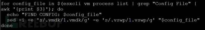 加密器由一个 Shell 脚本文件执行,该脚本文件使用各种命令行参数启动,包括公共 RSA 密钥文件、要加密的文件、不会加密的免费源码下载数据块、加密块的大小和文件尺寸。加密器使用 encrypt.sh shell 脚本启动,该脚本充当攻击背后的逻辑。启动时,脚本将执行以下命令来修改 ESXi 虚拟机的配置文件 (.vmx),以便将字符串“ .vmdk” 和“ .vswp” 更改为“ 1.vmdk” 和“ 1.vswp ”。