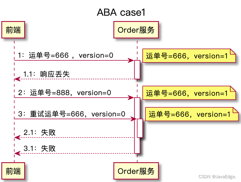 3.1 什么是ABA如订单支付后,seller要发货,发货完成后要填个快递单号。假设seller填个666,刚填完,发现填错了,赶紧再修改成888。对订单服务,这就是2个更新订单的请求。系统异常时666请求到了,单号更成666,接着888请求到了,单号又更新成888,但是666更新成功的响应丢了,调用方没收到成功响应,自动重试,再次发起666请求,单号又被更新成666了,这数据显然就错了!