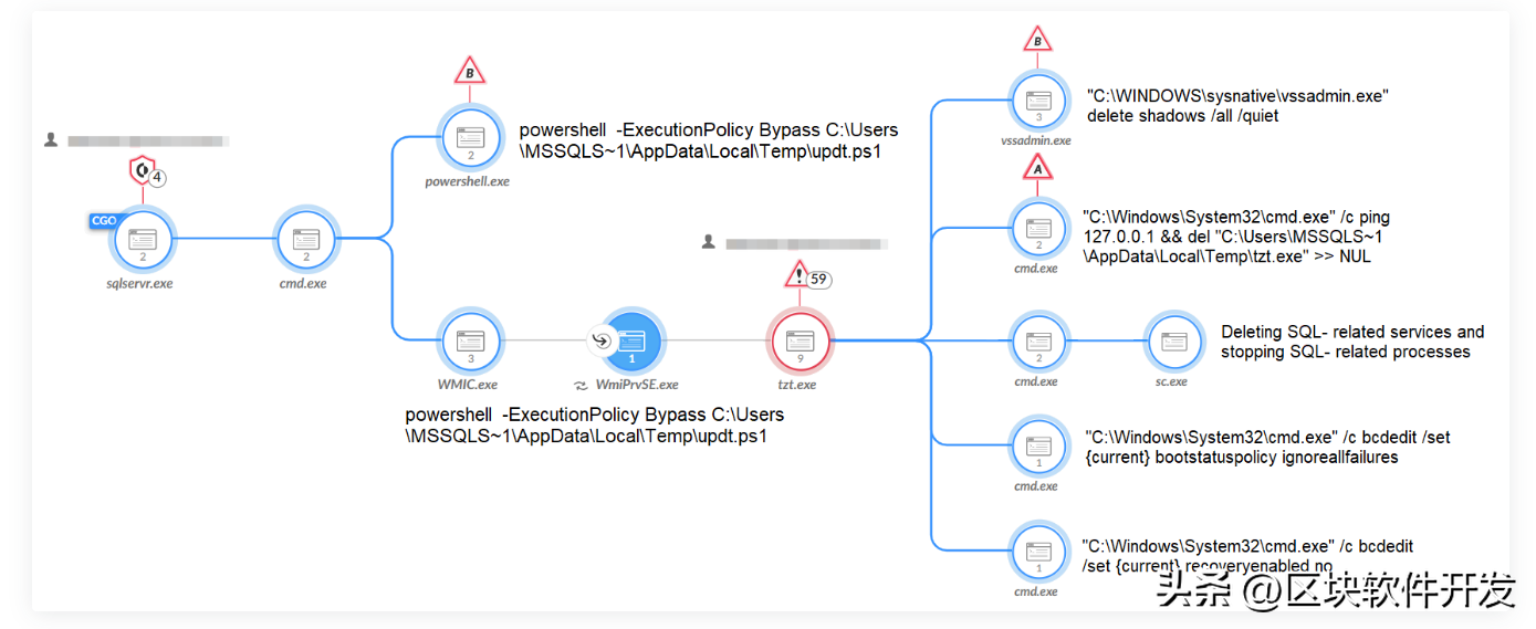 尝试使用sc.exe和net.exe停止和删除sql相关的服务。这样,勒索软件就可以访问并加密受害者的文件数据。