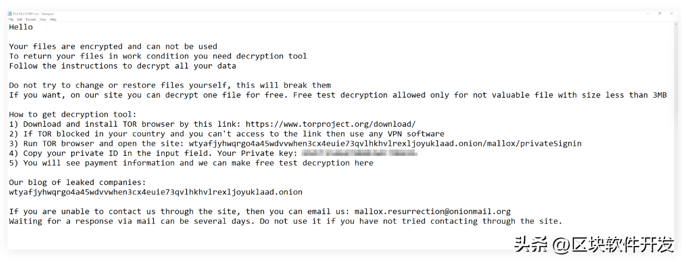Mallox在受害者驱动器的每个目录中都留下了一张勒索信,其中解释了感染情况并提供了联系信息,如下图所示。