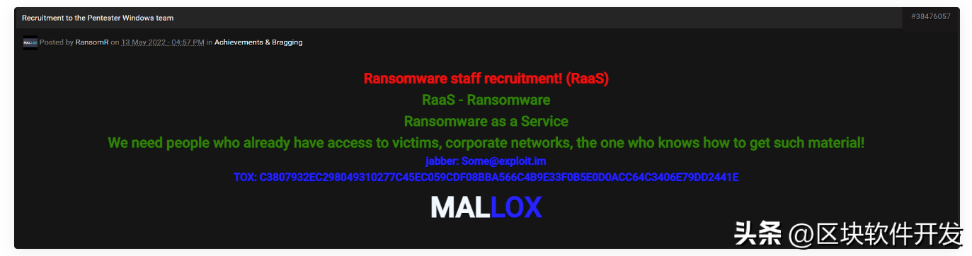 早在2022年5月,一位名叫RansomR的用户在著名的黑客论坛上发帖称,Mallox组织正在寻找加入该组织的附属公司。