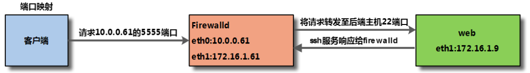 firewall-cmd --permanent --zone=<区域> --add-forward-port=port=<源端口号>:proto=<协议>:toport=<目标端口号>:toaddr=<目标IP地址>如果需要将当前的10.0.0.61:5555端口转发至后端172.16.1.9:22端口
